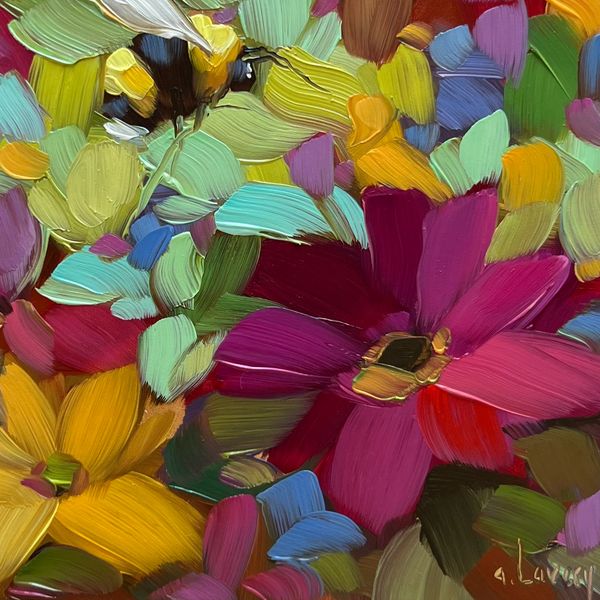 I paint with water-mixable oils, using water-mixable linseed oil to thin and create expressive fluid texture. I primarily work on small format panels. My focus is all about color and I try to squeeze as much as I can into these little works of art.